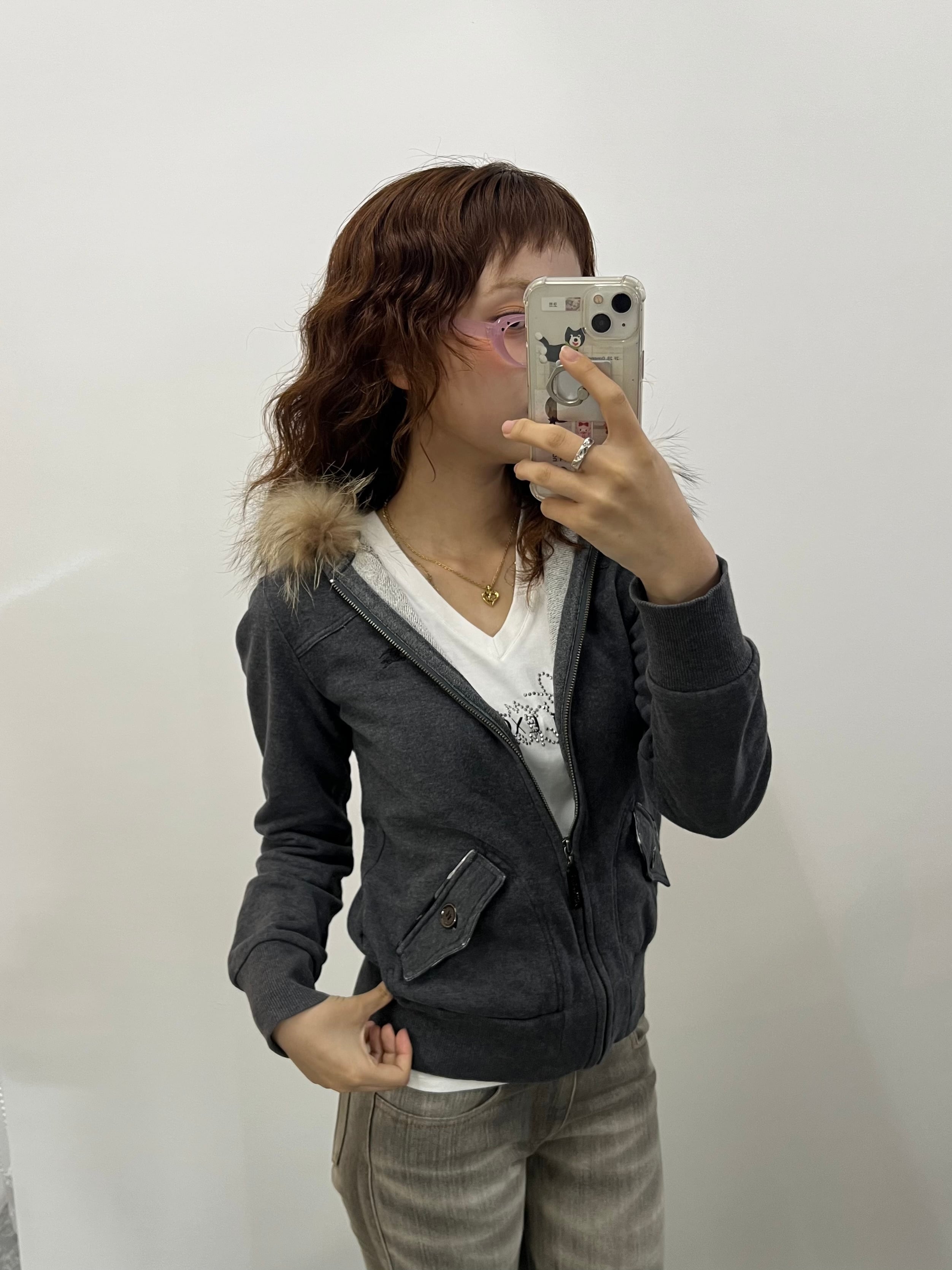 【BURBERRY BLUE LABEL】バーバリー ラクーンファージップアップフーディー grey