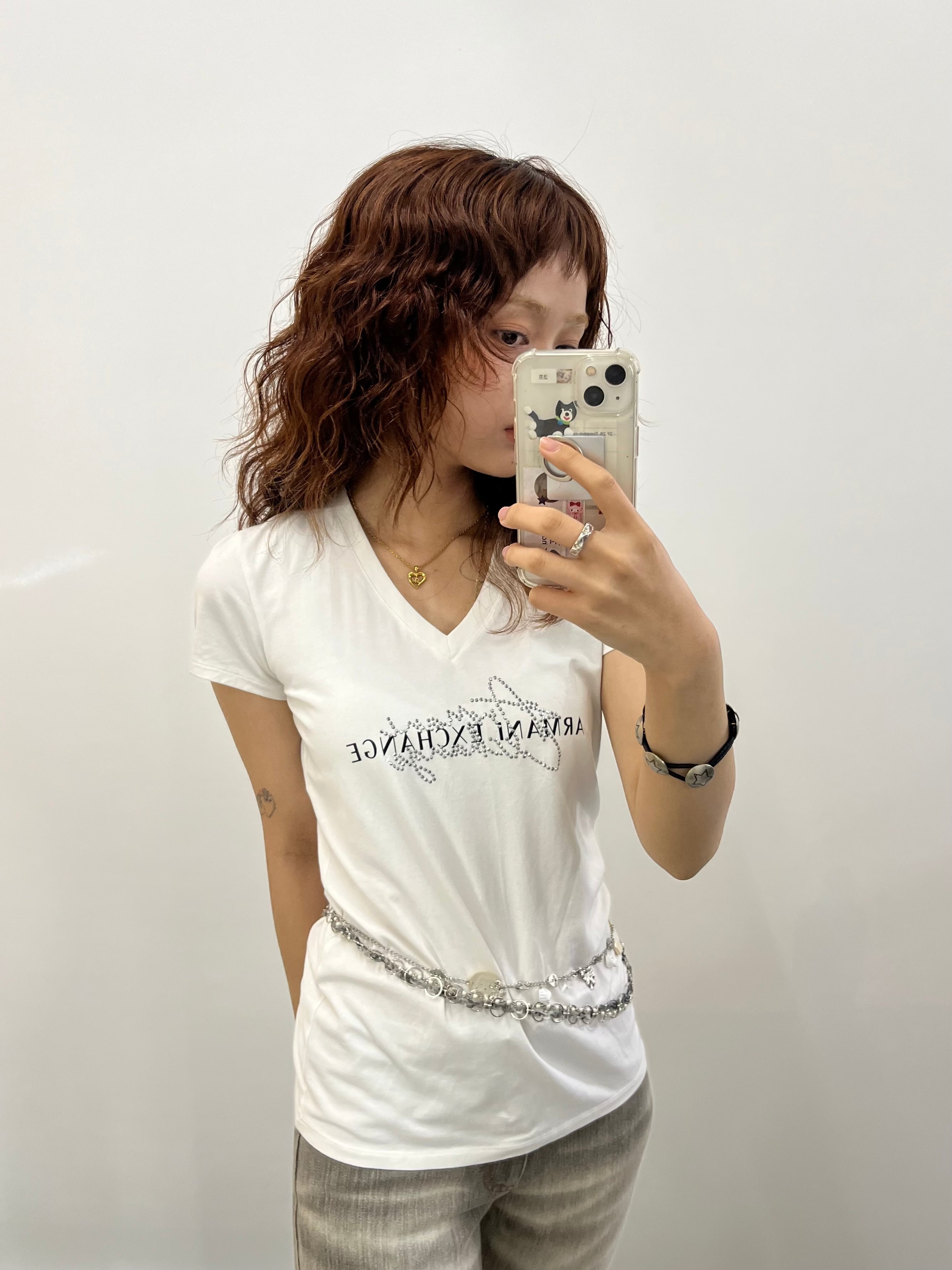【ARMANI EXCANGE】アルマーニ ラインストーンロゴデザインVネックピチTEE white