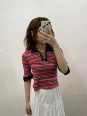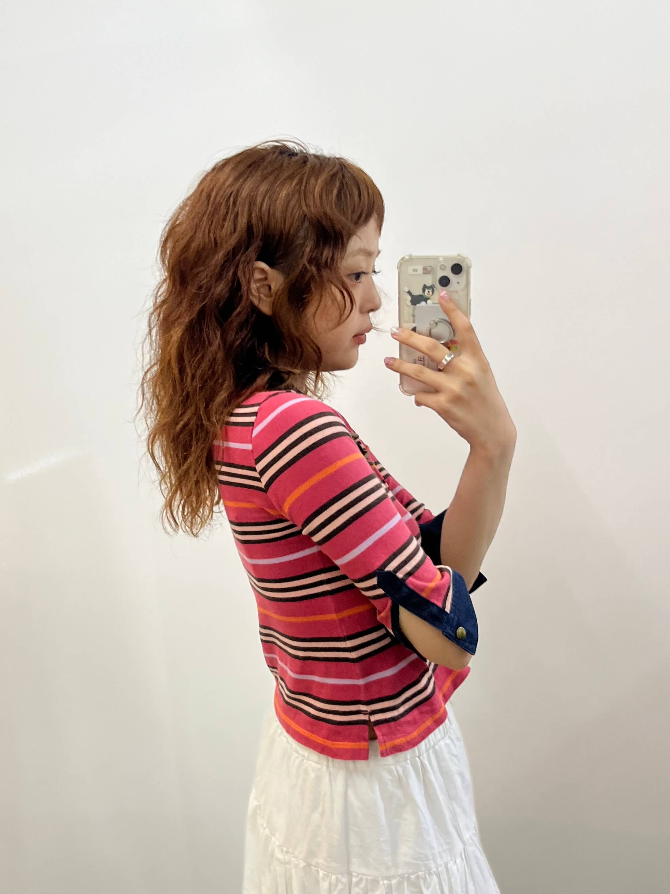 【BURBERRY LONDON】バーバリー デニム切替編み上げボーダー半端丈カットソー pink