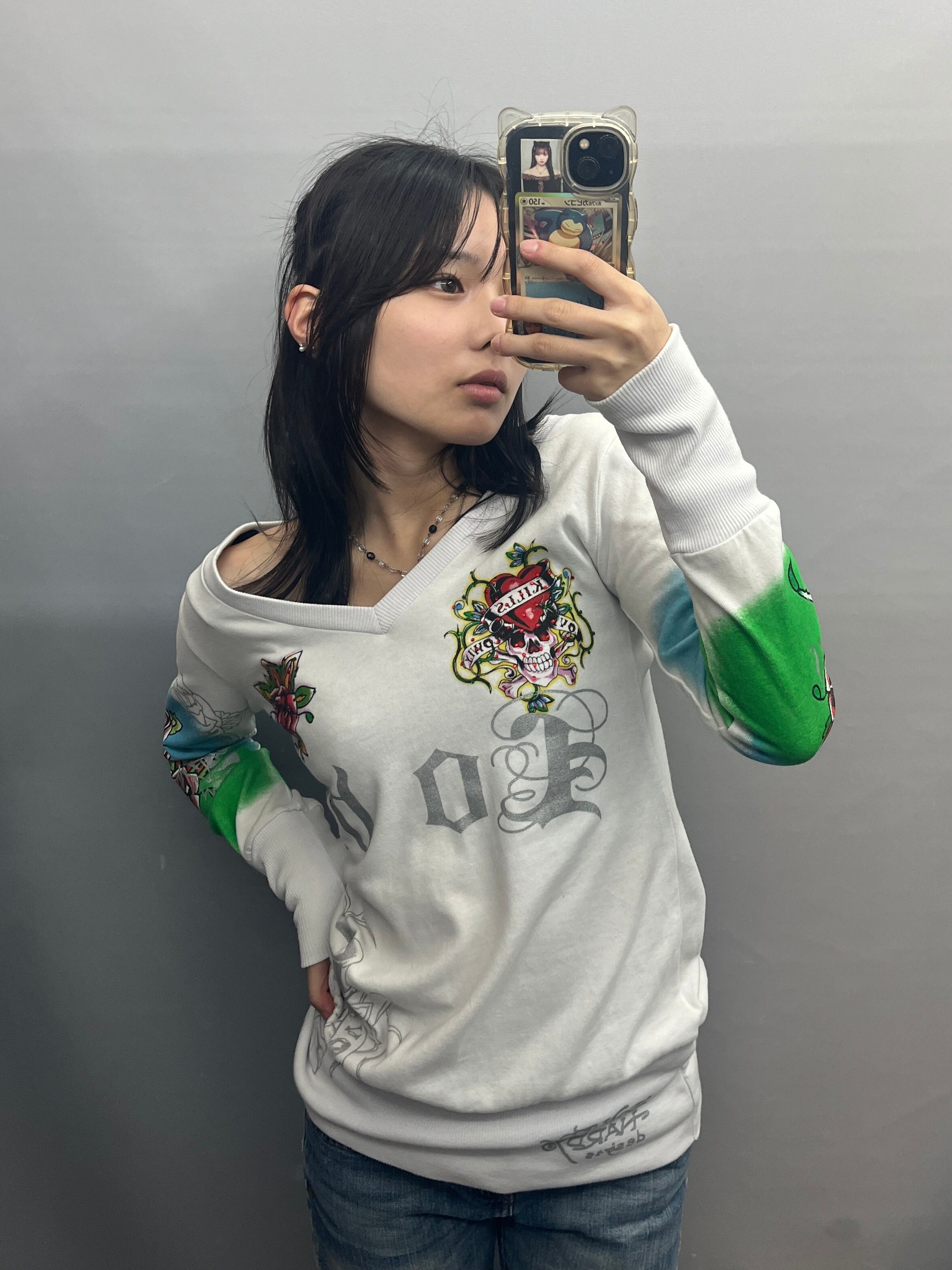 【Ed Hardy】エドハーディ タトゥープリントキラキラVネックピチスウェット