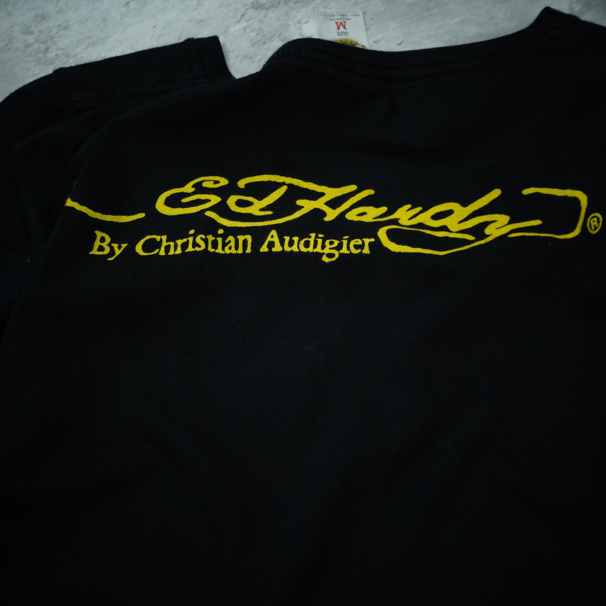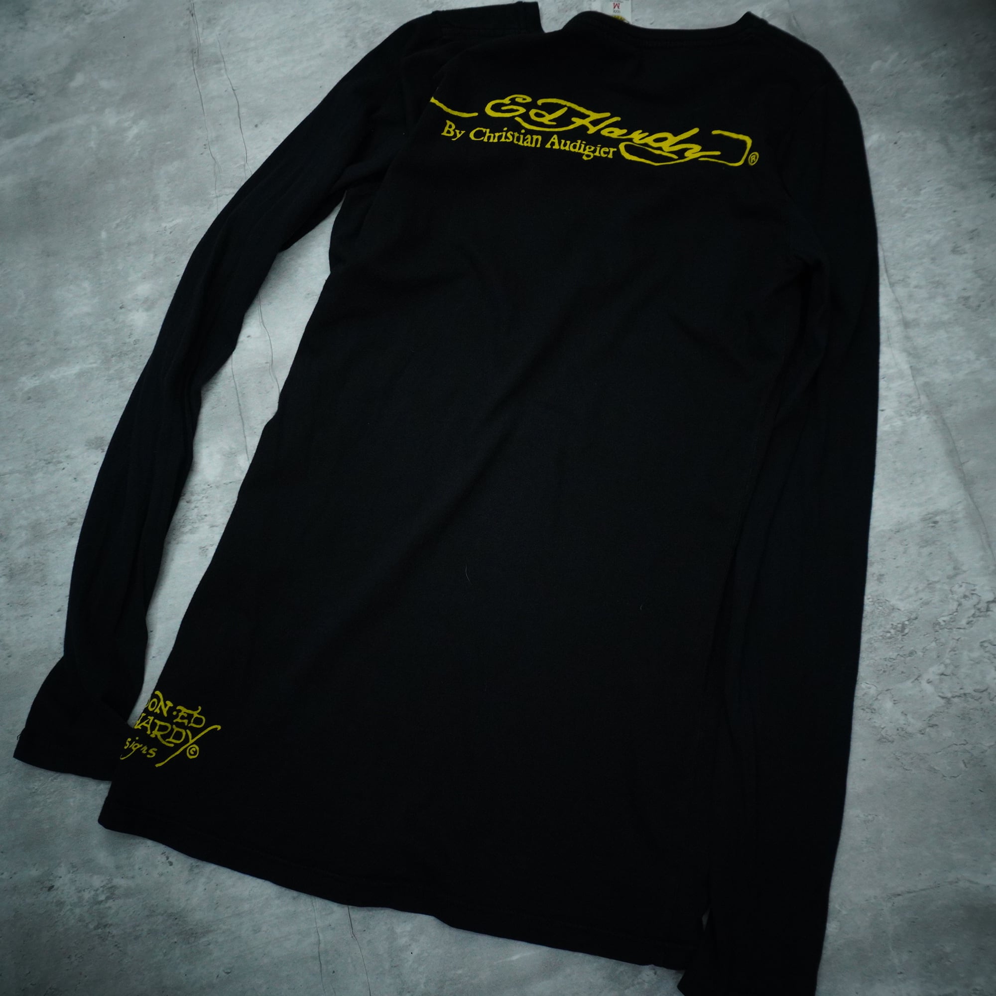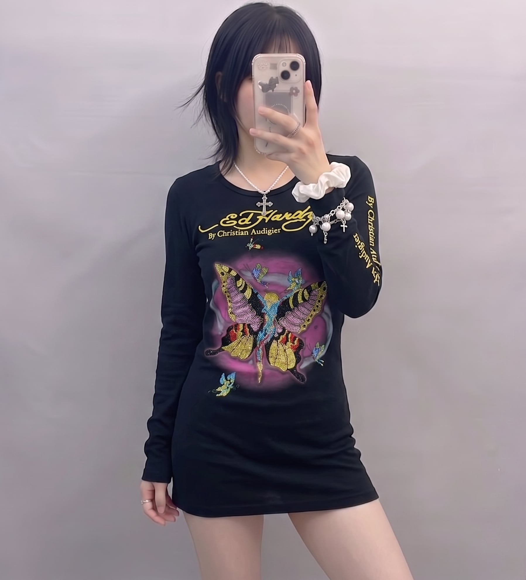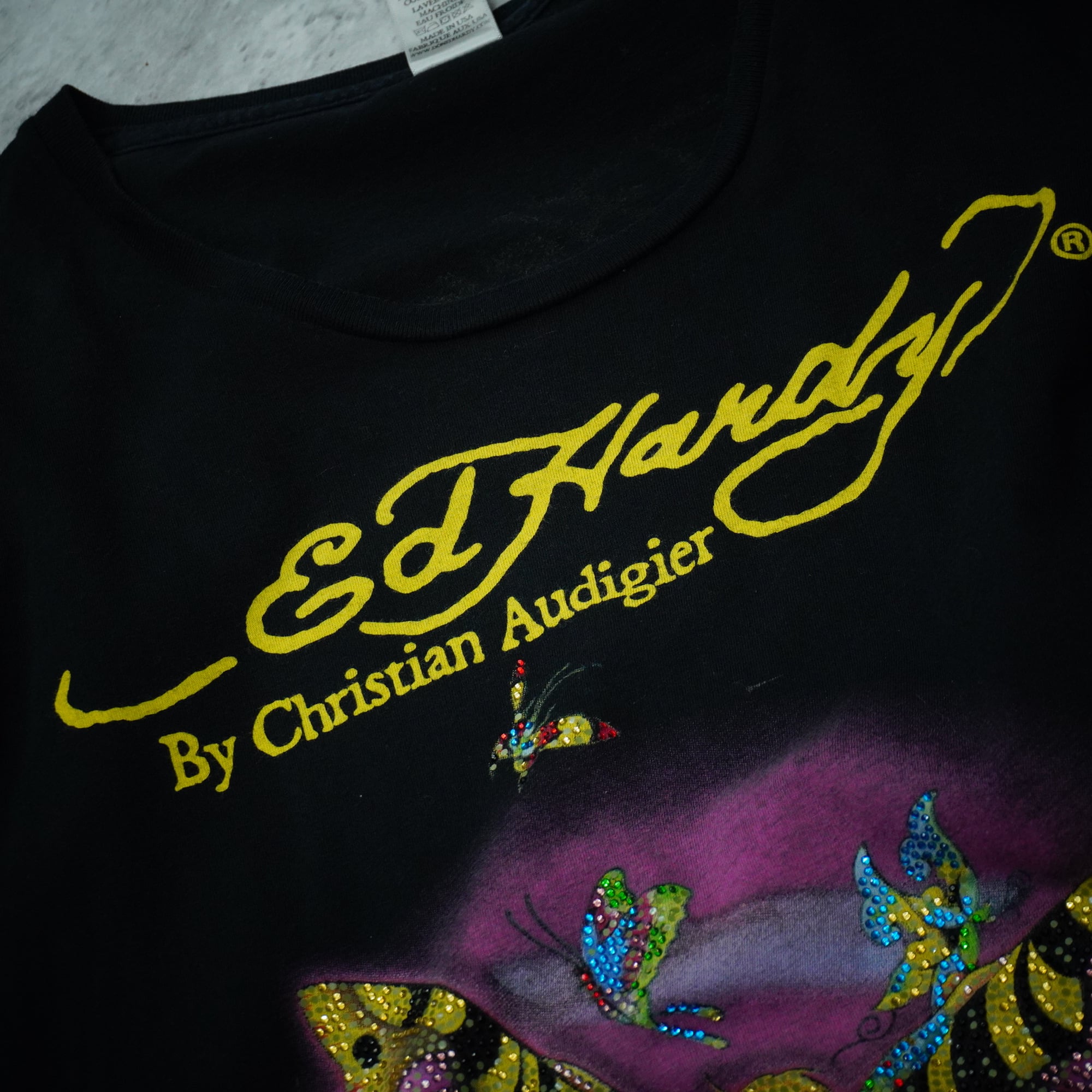 【Ed Hardy】USA製 キラキララインストーン蝶々プリントロンT